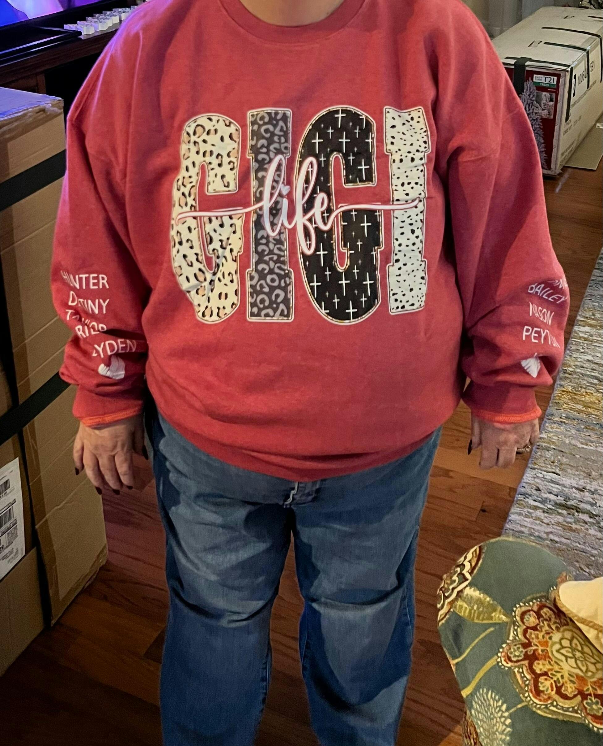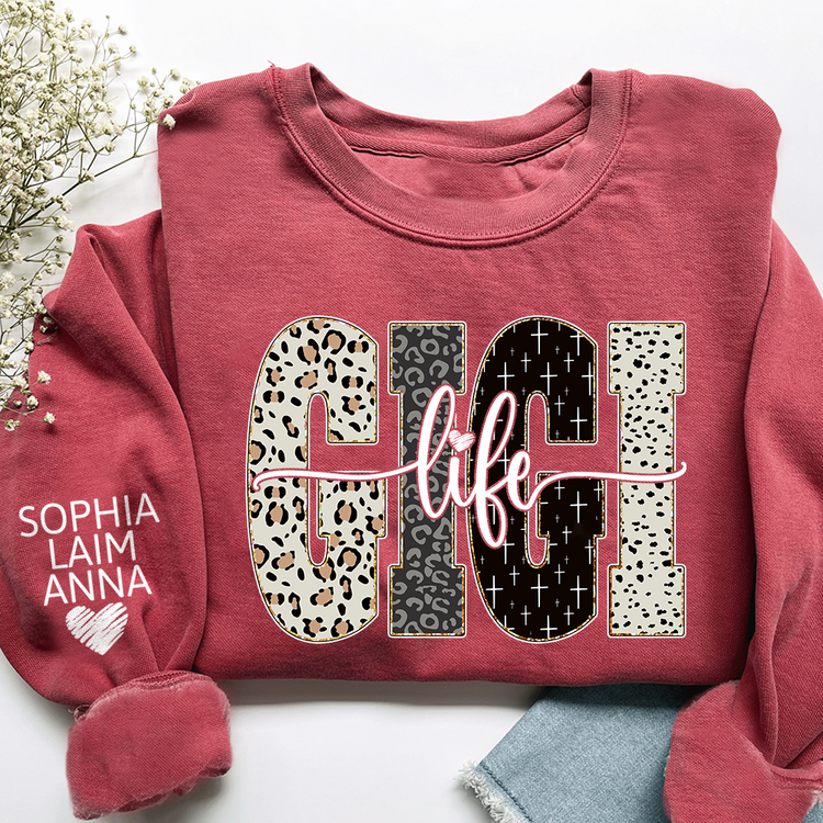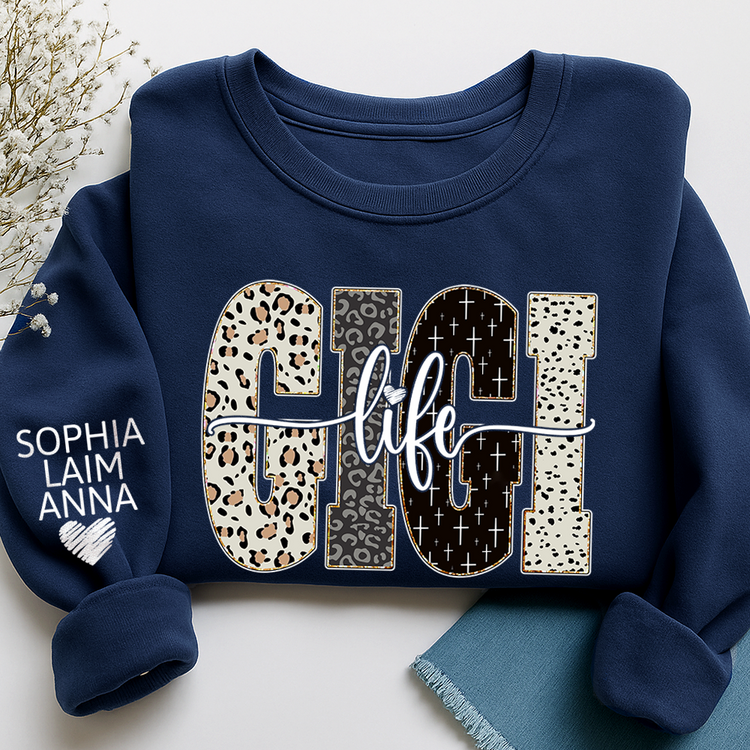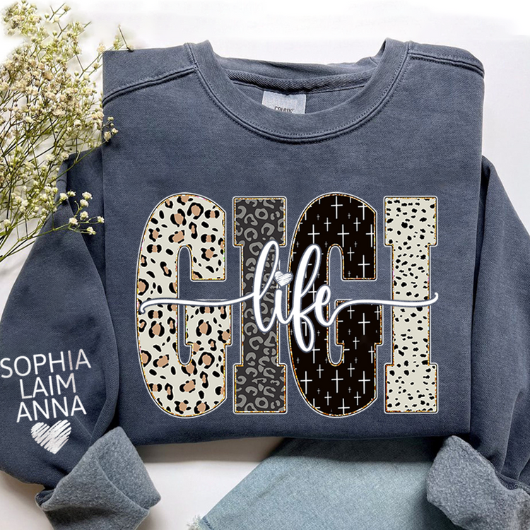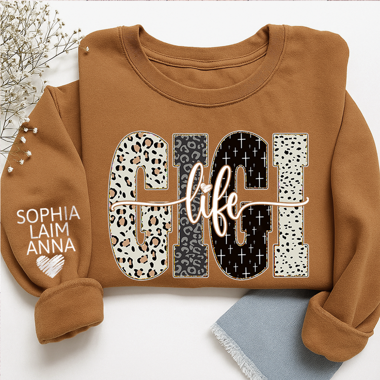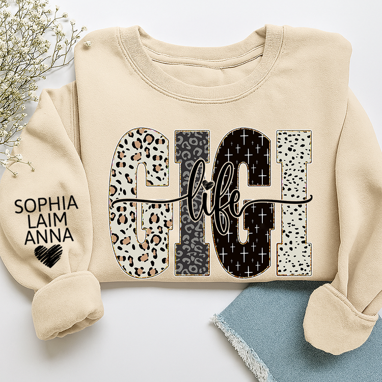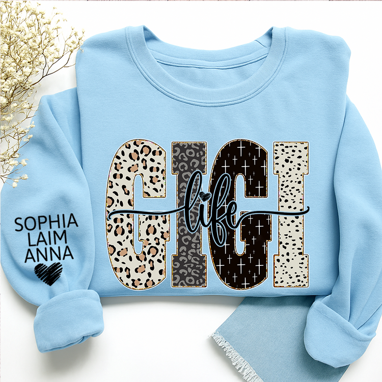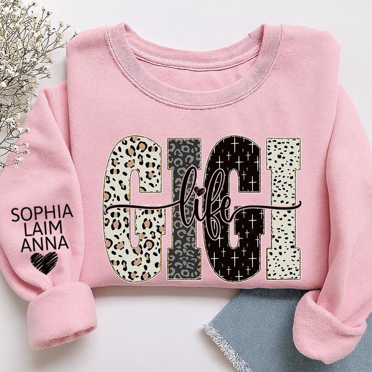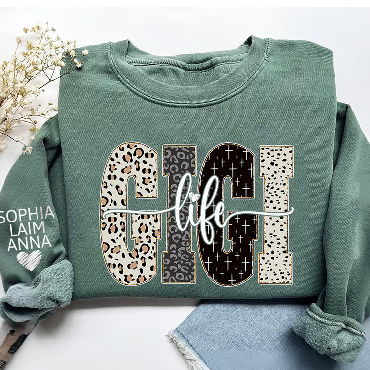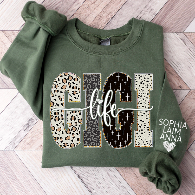 Personalized Gigi Sweatshirt – Animal Print Letters with Custom Grandkids’ Names on Sleeve