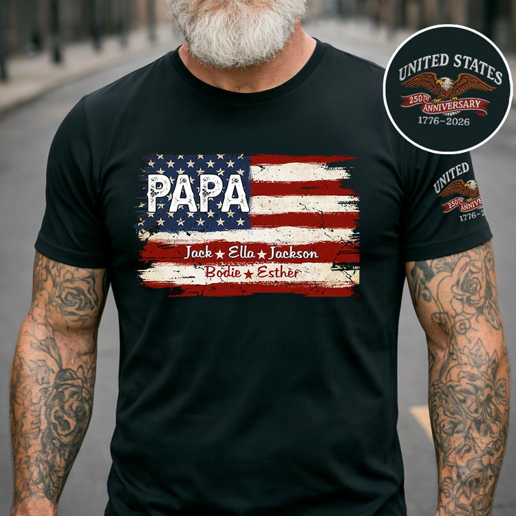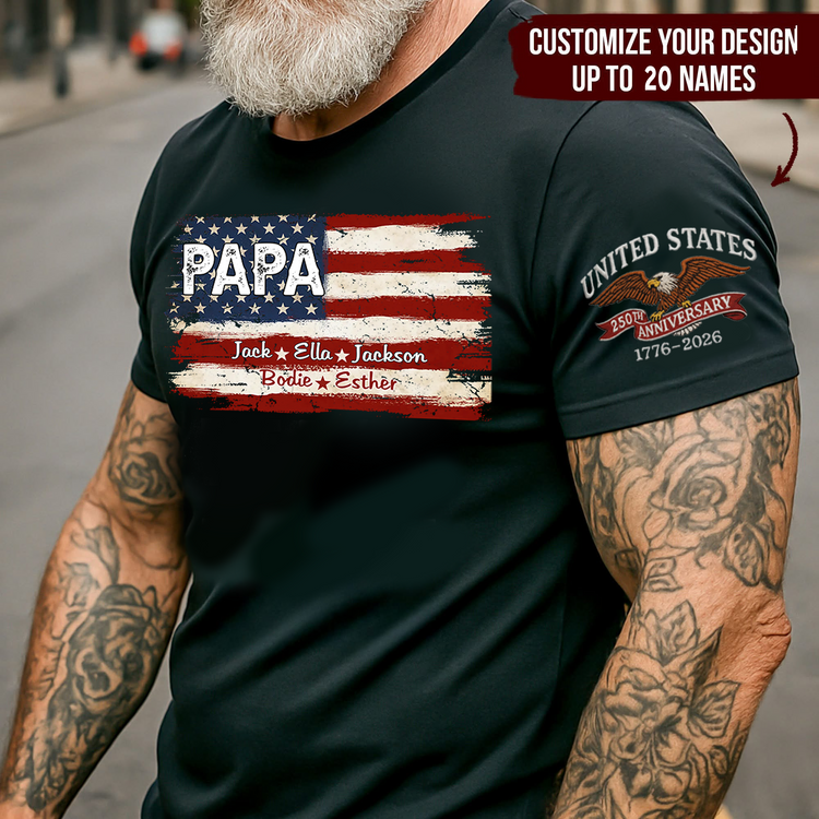 Custom Papa American Flag Shirt with Kids Names, Personalized Patriotic Papa T Shirt Family Gift