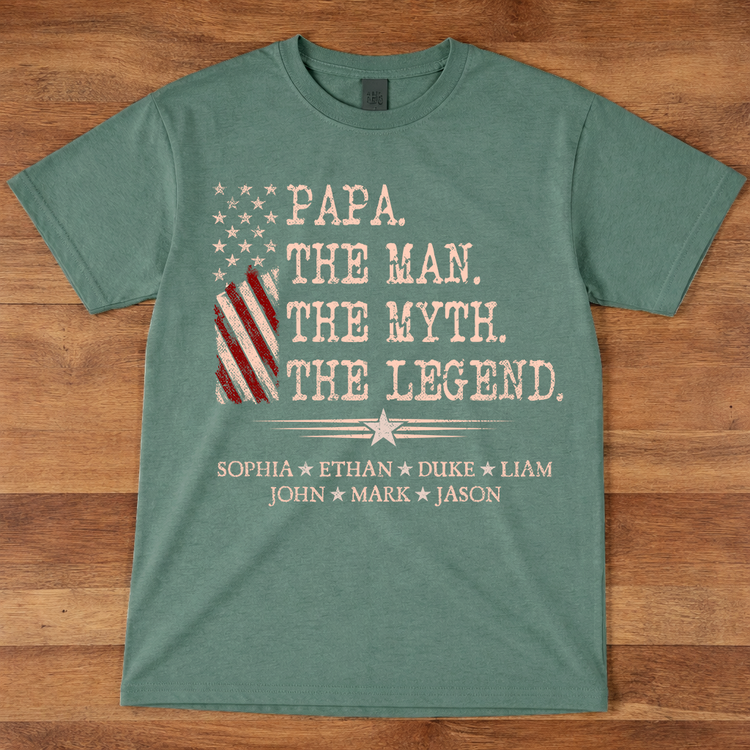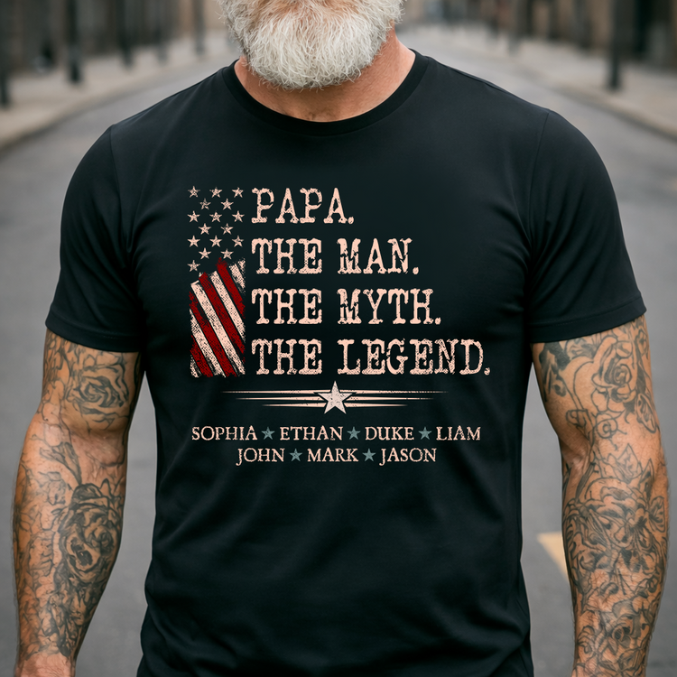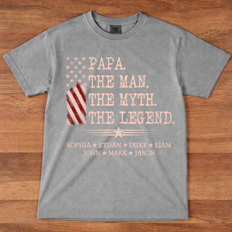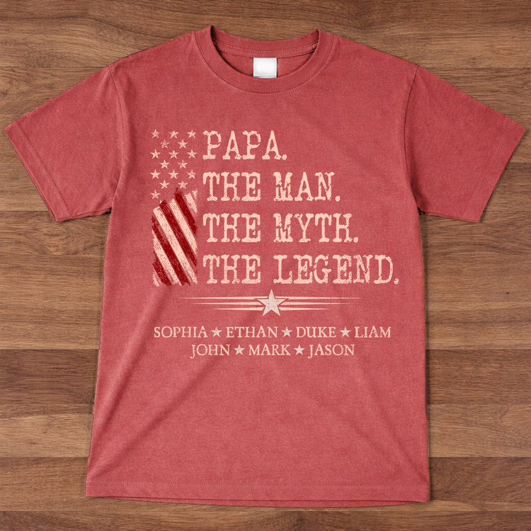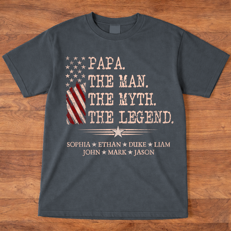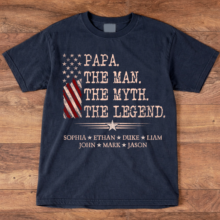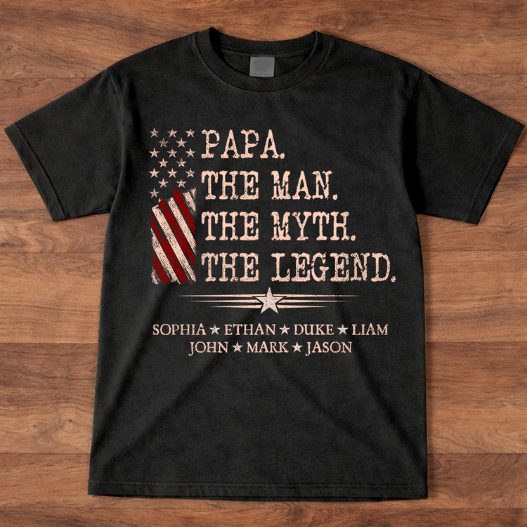 Papa The Man The Myth The Legend Shirt, Personalized Papa T-Shirt with Kids Names Patriotic American Flag Design