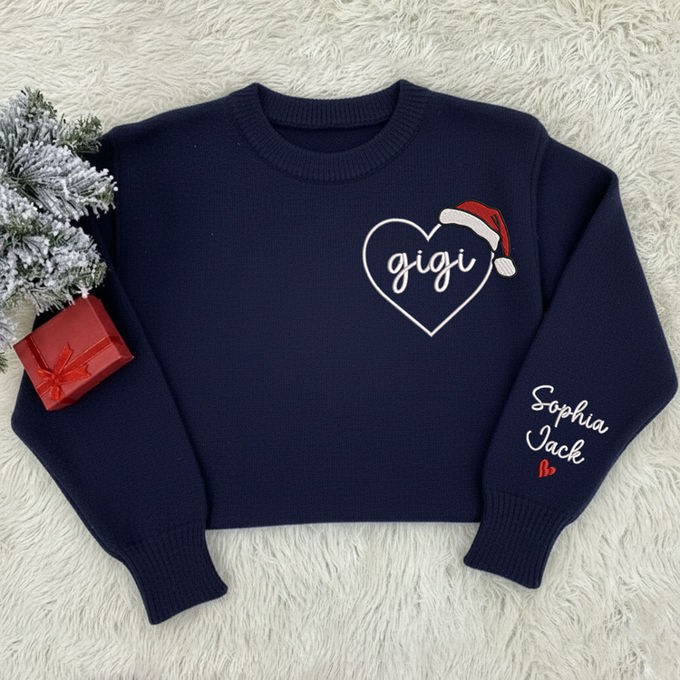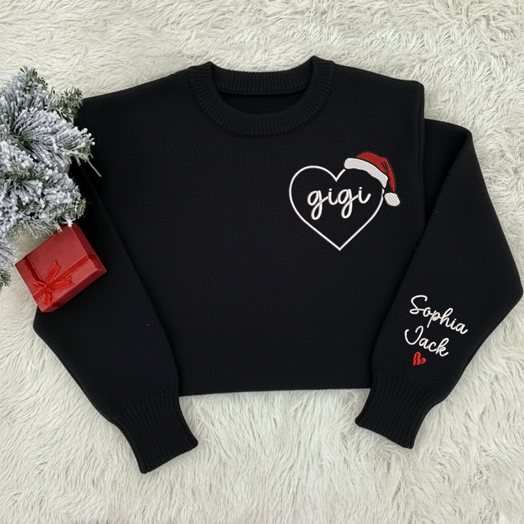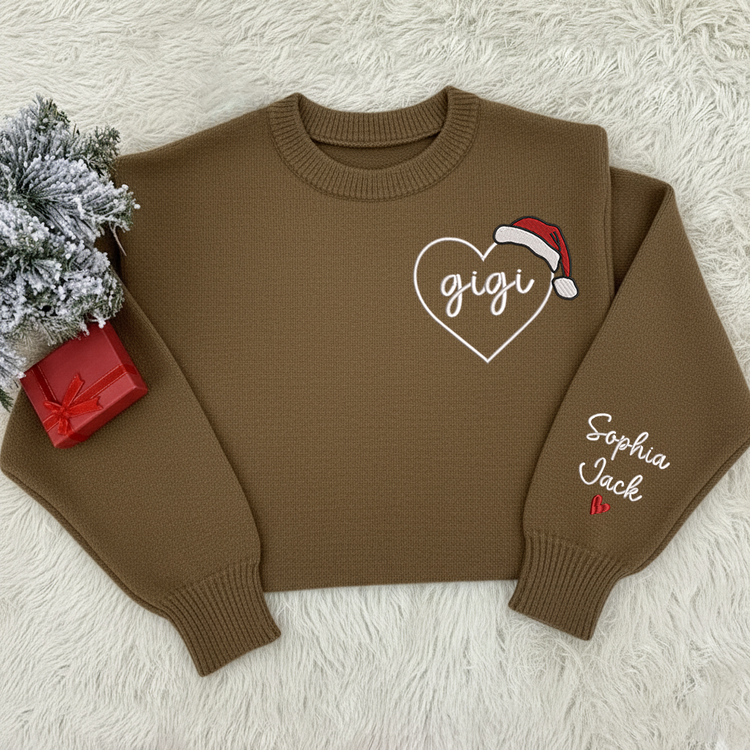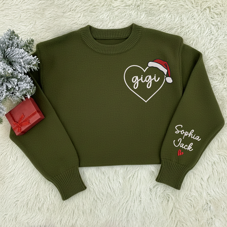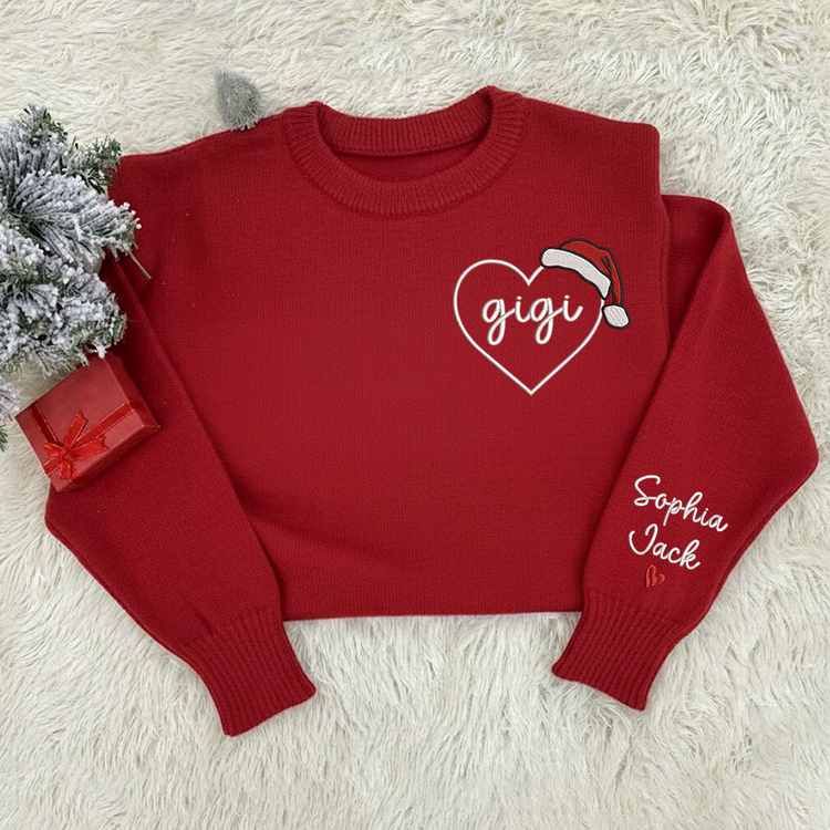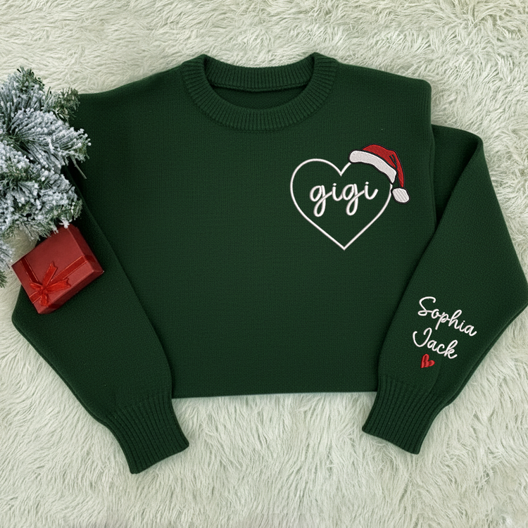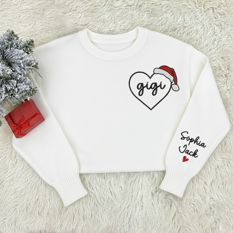 Personalized Embroidered Gigi Knit Sweatshirt – Custom Grandma Christmas Sweater With Kids Names & Santa Hat 2025