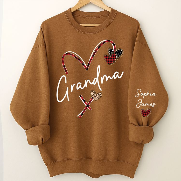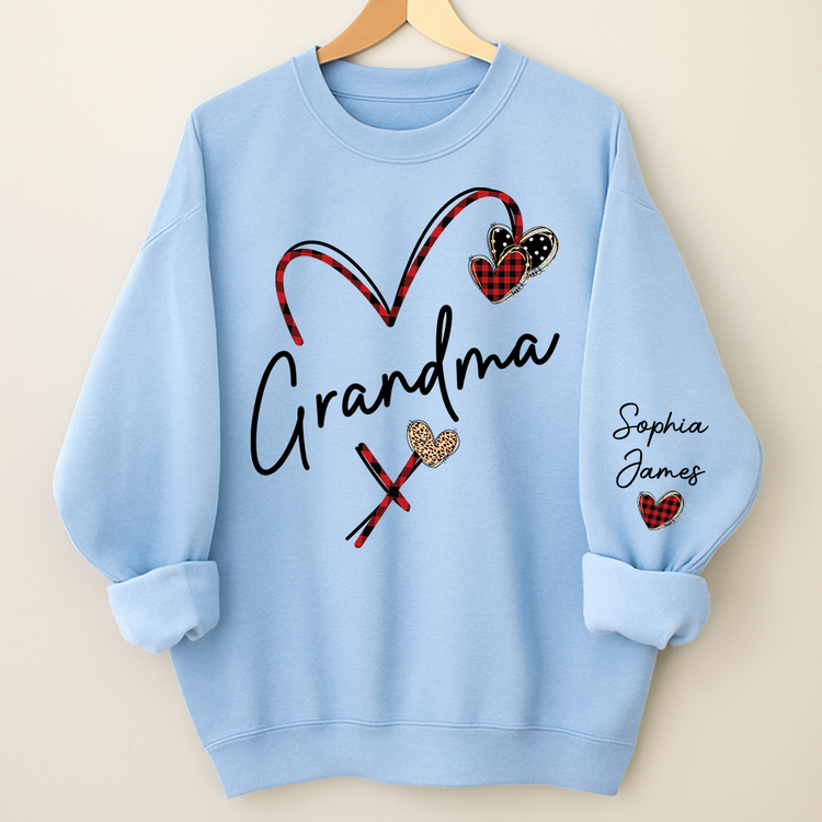 Personalized Grandma sweatshirt featuring custom grandchild names printed on the sleeve for a meaningful family touch.