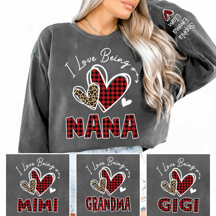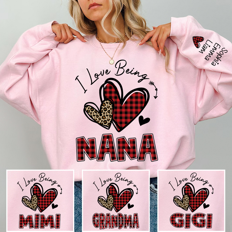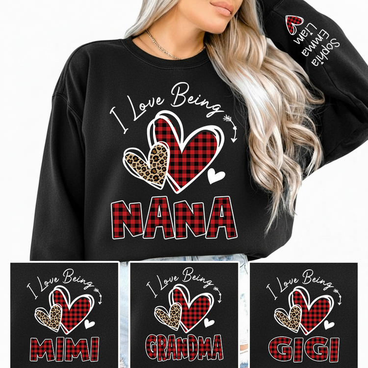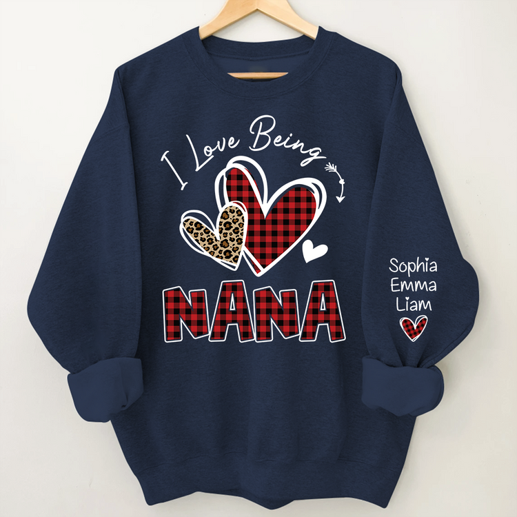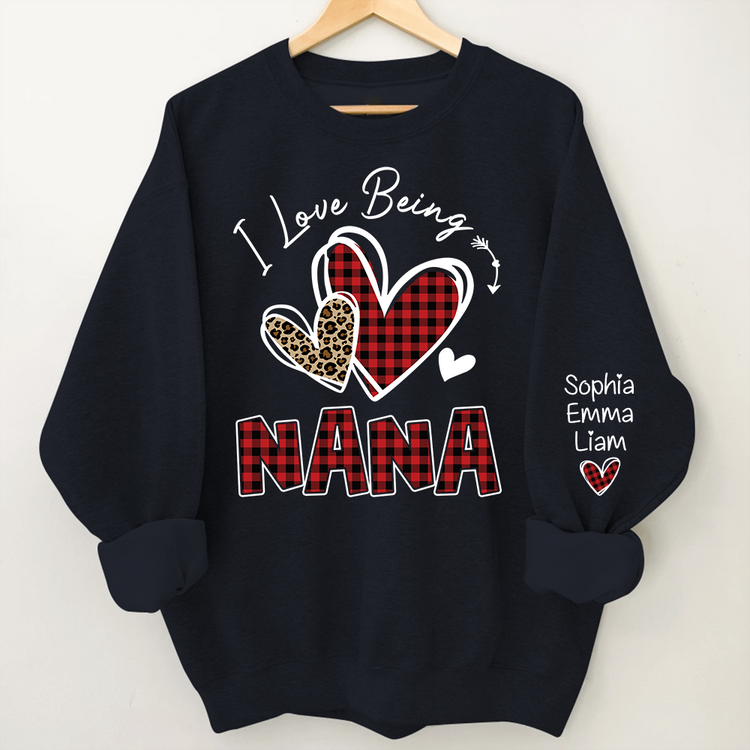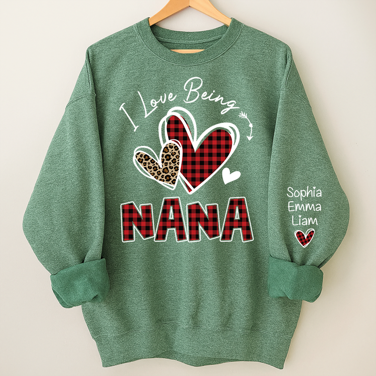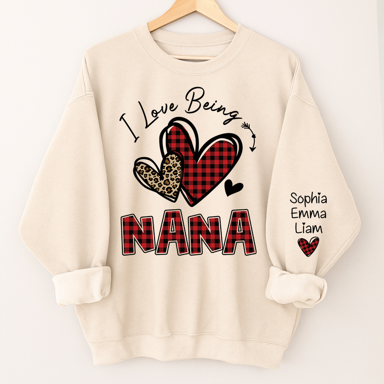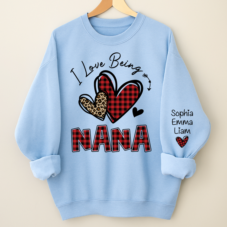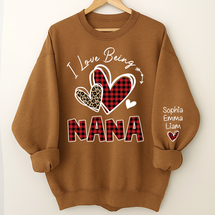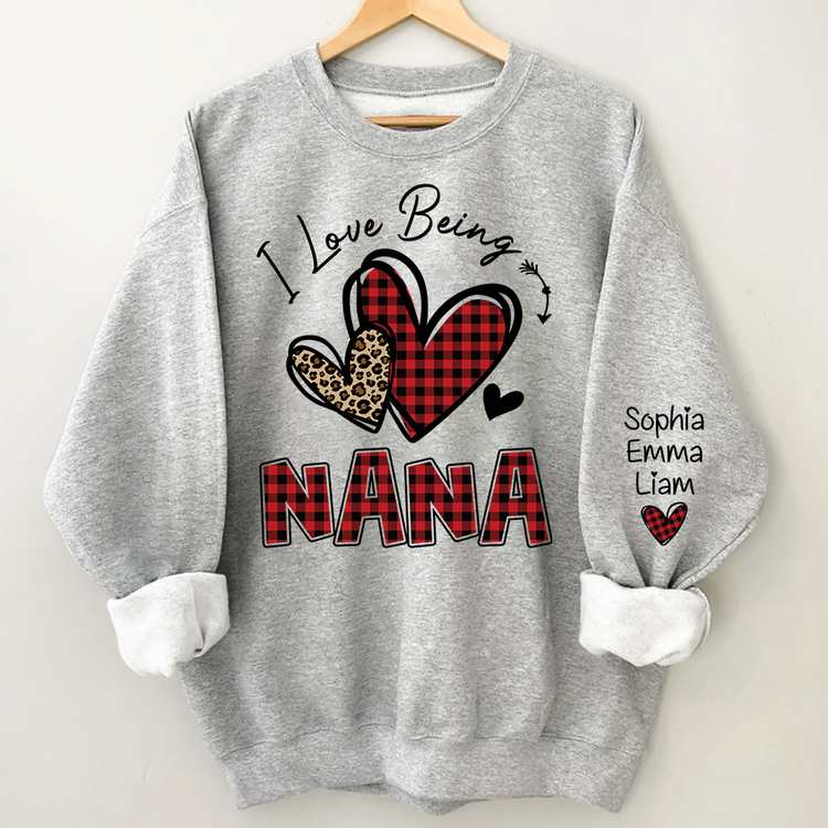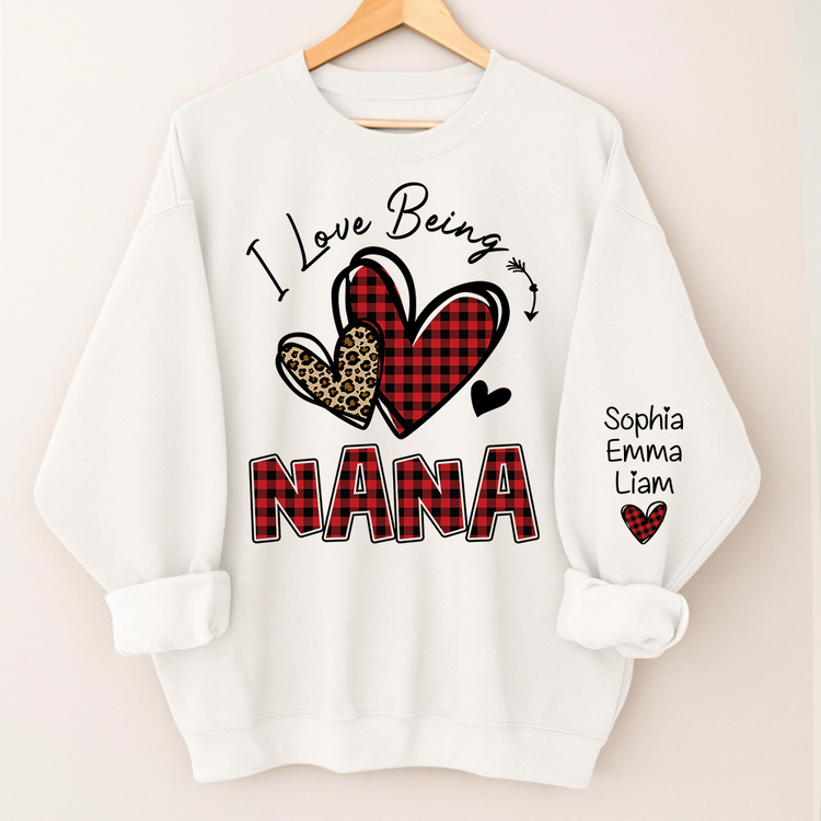Personalized “I Love Being Nana” sweatshirt with custom grandchild names printed on the sleeve for a heartfelt family touch.