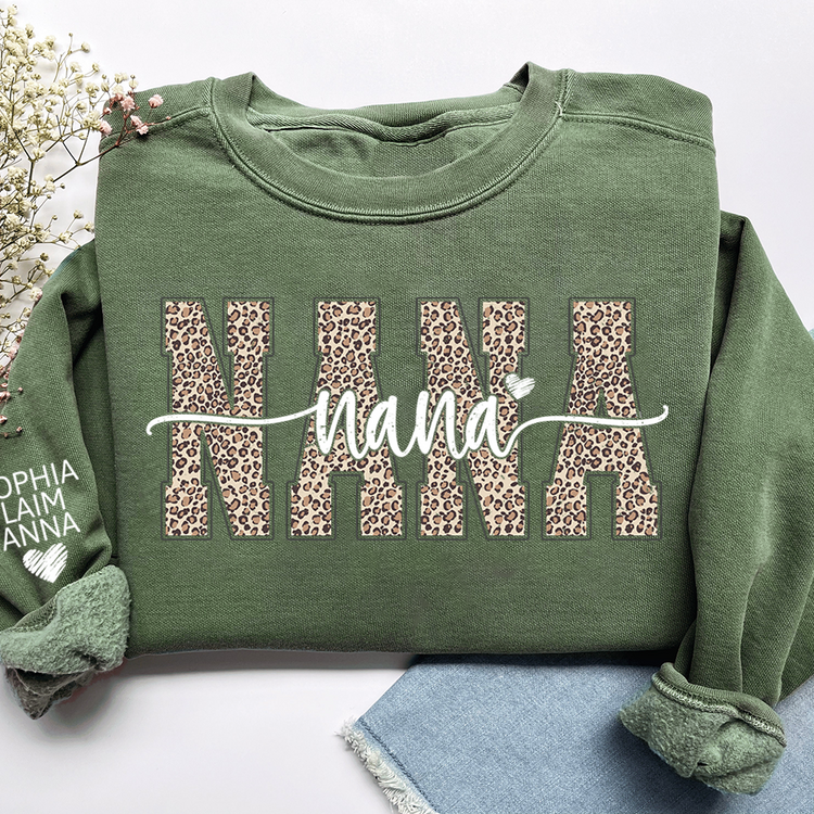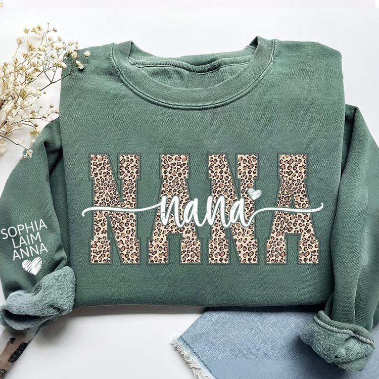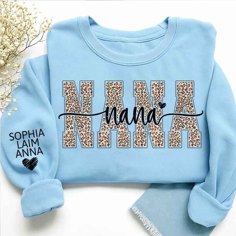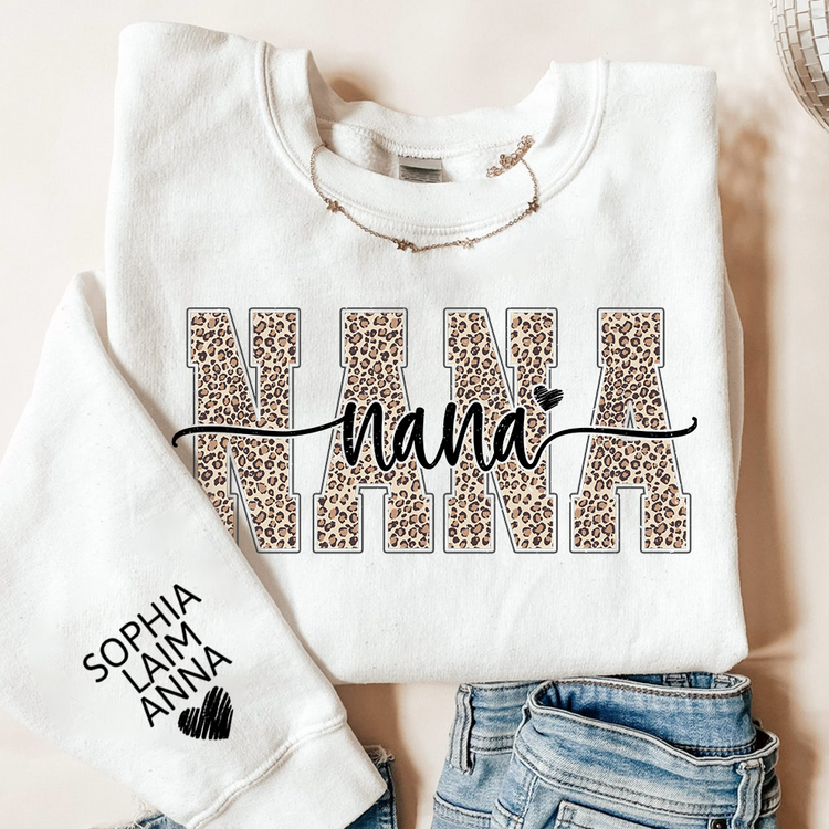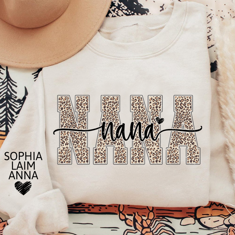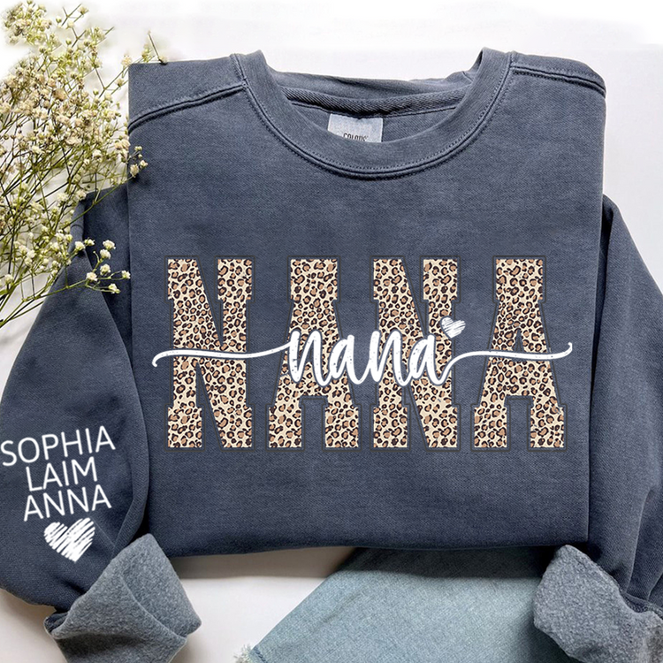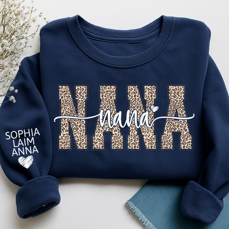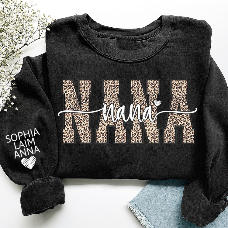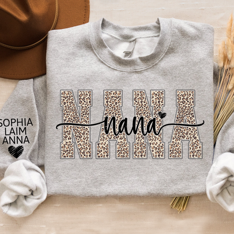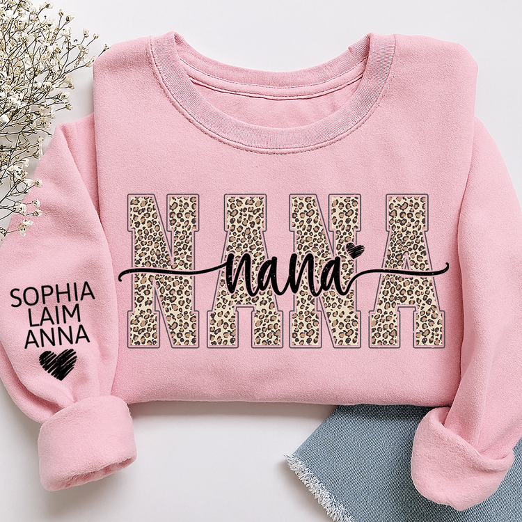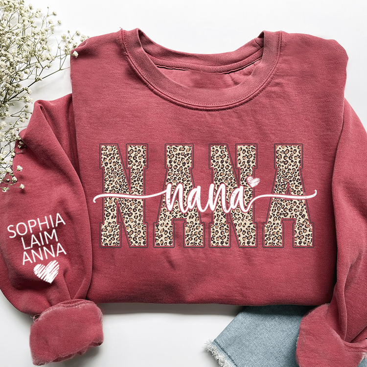 Personalized Nana Leopard Print Sweatshirt – Custom Grandkids’ Names on Sleeve, Heart Detail