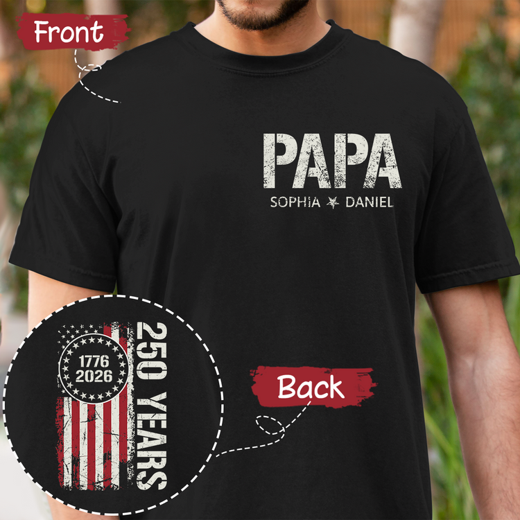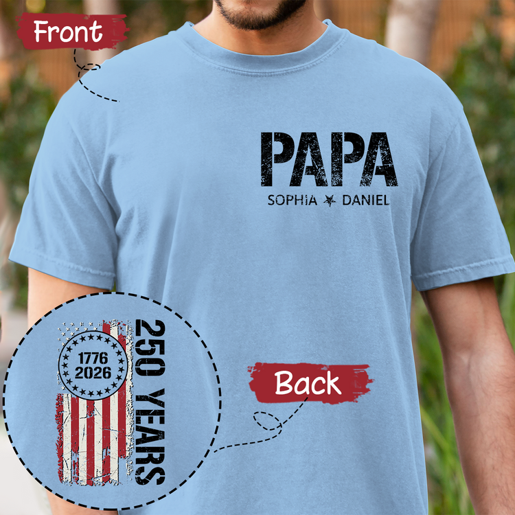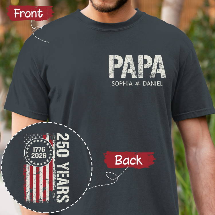 Personalized Papa T Shirt, Custom Family Names with Patriotic 250 Years of America Design, Perfect Gift for Father's Day